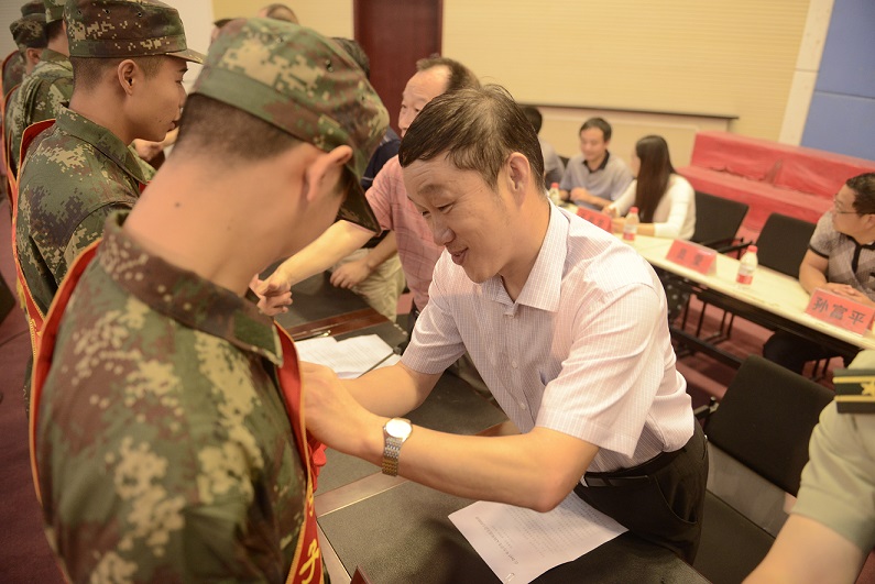 校领导为入伍学生代表佩戴红花