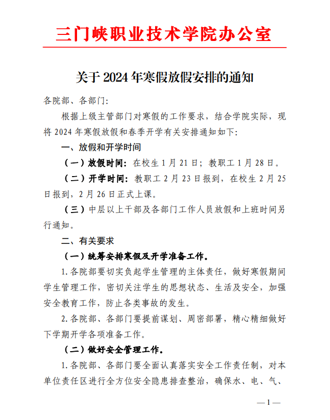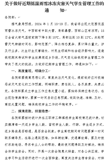 学校领导一直高度重视校园安全稳定工作,定期召开会议,安排部署校园安全工作。在每学期开学初和学期末,都要召开专题会议,研究安排部署学生返校和假期安全工作。今年1月初,学校制定并下发了《关于2024年寒假工作安排及有关要求的通知》,学生处下发了《关于做好近期低温雨雪冰冻灾害天气学生管理工作的通知》和《2024年寒假致全体学生及家长的一封信》,落实安全工作责任、做好假前安全隐患排查,全力保障寒假、春节期间校园安全稳定、和谐有序。针对放假前校园安全隐患排查,学生安全返乡教育,学生假期居家安全教育等提前安排部署。