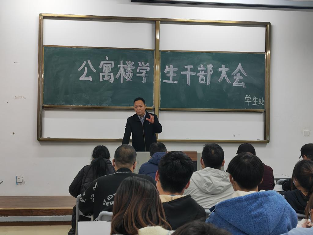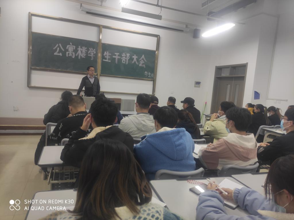 2021年11月18日晚,学生处在51201教室召开了公寓楼学生干部大会。学工部副部长、学生处副处长刘学文;学生处南博老师、公寓管理中心全体人员,各公寓楼楼长、公寓楼管理员代表、全体公寓楼学生干部参加了会议。