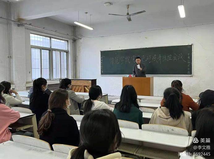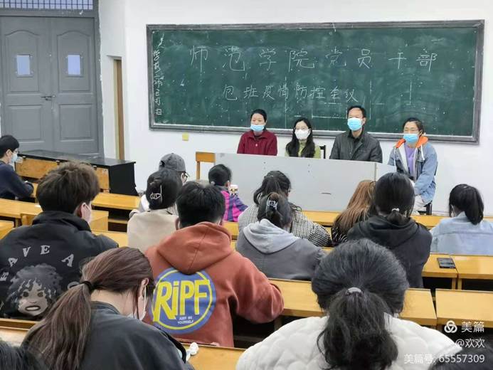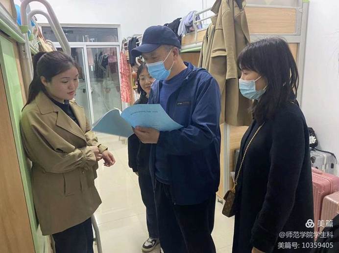 为认真落实省教育厅疫情防控会议和学校第六次疫情防控工作会议部署要求,科学精准做好校园疫情防控,提升应急处置能力,4月1日始,师范学院开展“党员领导干部包班、进宿舍,共建平安校园”活动。学院领导班子成员带头开展工作,深入宿舍班级,督导卫生消杀。教研室科室负责人包班进班,与辅导员一起召集班级会议开展防控疫情主题班会,党员志愿者入宿舍、一对一与学生建立联系,引导学生开展防疫与卫生清洁。党政办教学科学生科实训科按照要求核查登记师生实际情况,及时统计数据并上报。进行宣传发动,使人人重视防疫、投入到防疫工作中,制做教工、学生防疫各“十要求”、防疫“应急处置流程”宣传防疫专版,放置于新老校区教学大厅,提升师生防疫自觉意识。