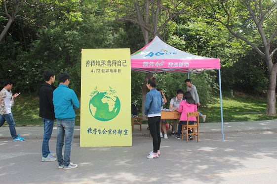 4月22日是世界环境日,校学生会卫生部在一号餐厅对面开展“世界环境日”宣传活动。