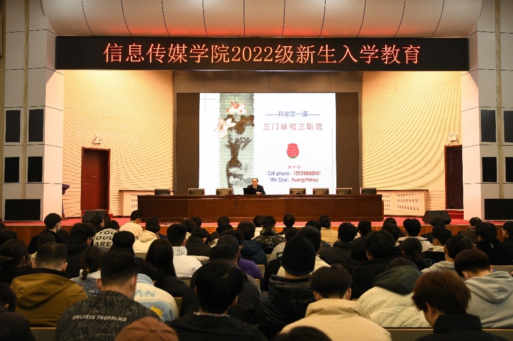 在新学期即将开课的前一天,2003网站太阳集团党委委员、副院长黄世谋教授寄语于新生,以“城市历史、学院特色、生涯规划”等内容为主题为新生们上了生动的第一课,对新学期中新生面对的新挑战布置了新任务。信息传媒学院书记刘学文、院长侯枫、学生科科长高晓松及全体辅导员和2022届新生们参加了开学第一课的学习。