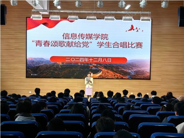 为深入学习贯彻习近平新时代中国特色社会主义思想和党的二十届三中全会精神, 赓续红色血脉,继承和弘扬“一二·九”精神,激发当代青年学子的爱国热情与奋斗精神。12月8日,信息传媒学院党总支在5号教学楼5137报告厅举办“青春颂歌献给党”歌咏比赛。